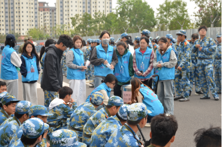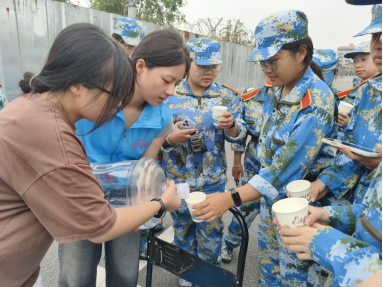 活动筹备阶段,服务队与食堂充分协调,确保饮用水资源充足供应,并依据天气状况科学调配水温——高温时段配送凉水解暑,天气转凉则及时供应温水,切实贴合新生身体所需。服务过程中,志愿者不仅在训练场边设立固定取水点,整齐摆放饮用水和桌椅,还特别推出“流动送水”模式,手推小车穿梭于各训练区域,主动为距离较远或仍在坚持训练的新生递上温度适宜的水,让志愿关怀覆盖每一个角落。令人感动的是,不少参训新生在休息间隙自发加入服务行列,协助分发清水、整理物资,以实际行动回应这份温暖。