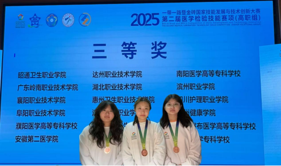 2025年11月27日至2025年12月1日在福建漳州卫生职业学院举行的2025“一带一路”暨金砖国家技能发展与技术创新大赛之第二届医学检验技能赛(高职组)全国总决赛中,安徽第二医学院医学技术学院的周宝宝、王思宇、彭欣瑶三名学生代表学校参赛,荣获全国三等奖。这一奖项不仅是我校学子专业技能水平的卓越展现,也是我校持续推进实践教学改革、深化产教融合成果的生动体现。