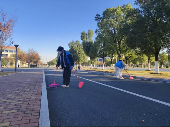 周末清晨,他们身着统一志愿服,携带扫帚、簸箕、垃圾袋等工具,精神饱满地在指定区域集结,以小组为单位,划分责任片区,重点对教学楼主干道两侧、初心广场及公共休闲区域的落叶和枯枝进行了地毯式清理。初冬的寒风未能阻挡大家的热情,现场一片热火朝天的劳动景象,鲜艳的志愿服在校园里跃动,成为一道亮丽的风景线。